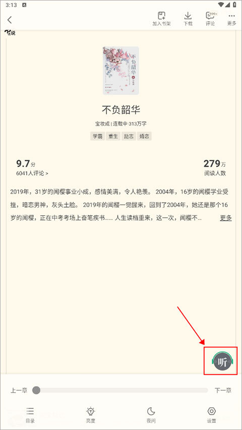 1、进入小说阅读界面后,轻点屏幕,右下角就会出现一个“听”字按钮。
