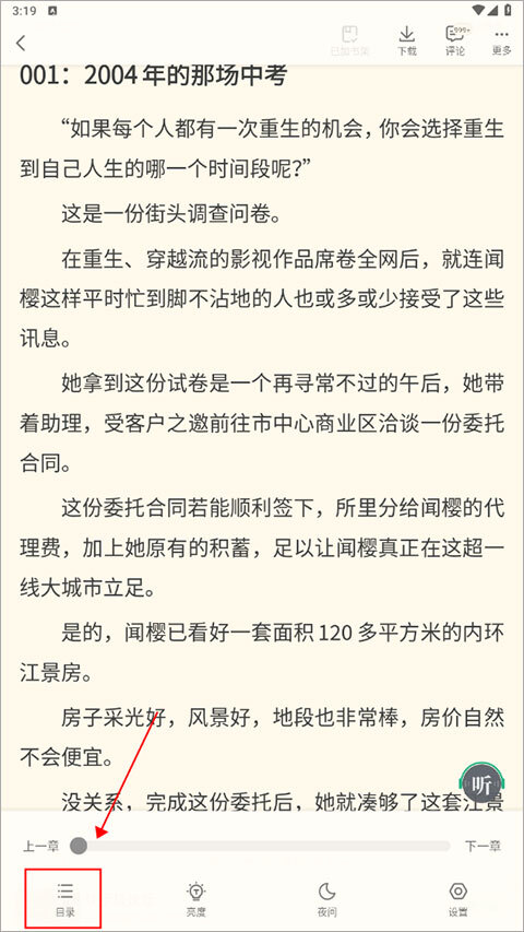 1、在小说阅读页面点击屏幕,接着点击左下角的“目录”按钮,就能自主选择想要阅读的章节。