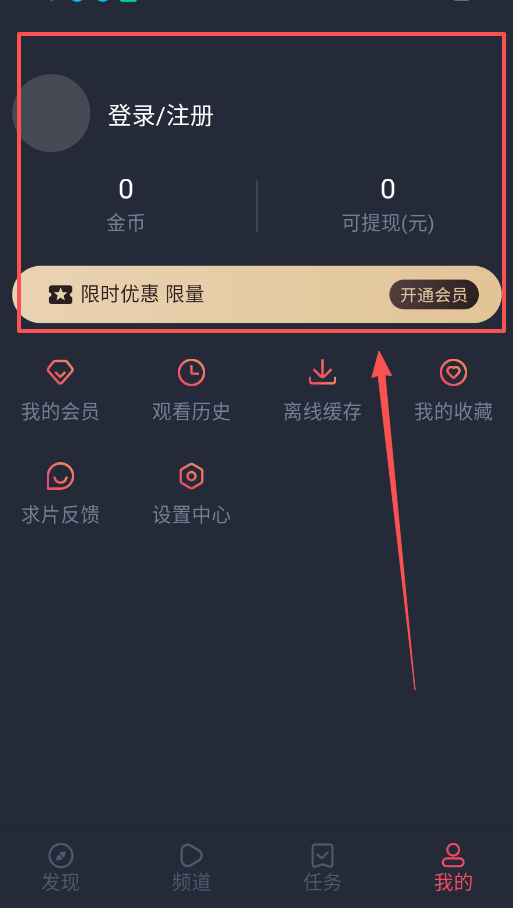 1、刚安装好软件后,先点击底部的“我的”选项完成登录或注册操作,登录成功后就能查看自己的金币数量和账户余额了,开通会员还能享受相应的优惠活动。