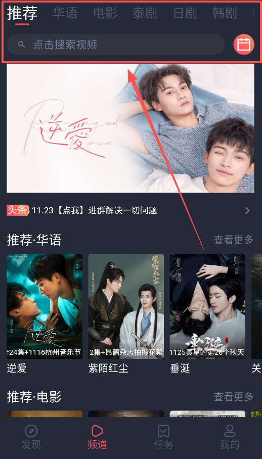 3、想看剧的话就去“发现”页面,这里已经按照华语、电影、泰剧等类别分好类了,首页推荐还会展示《逆爱》《紫陌红尘》等热门内容。