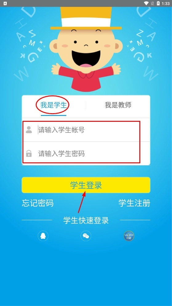 2、选择【我是学生】选项,输入学生账号与密码,点击【学生登录】按钮,即可进入学生端界面。