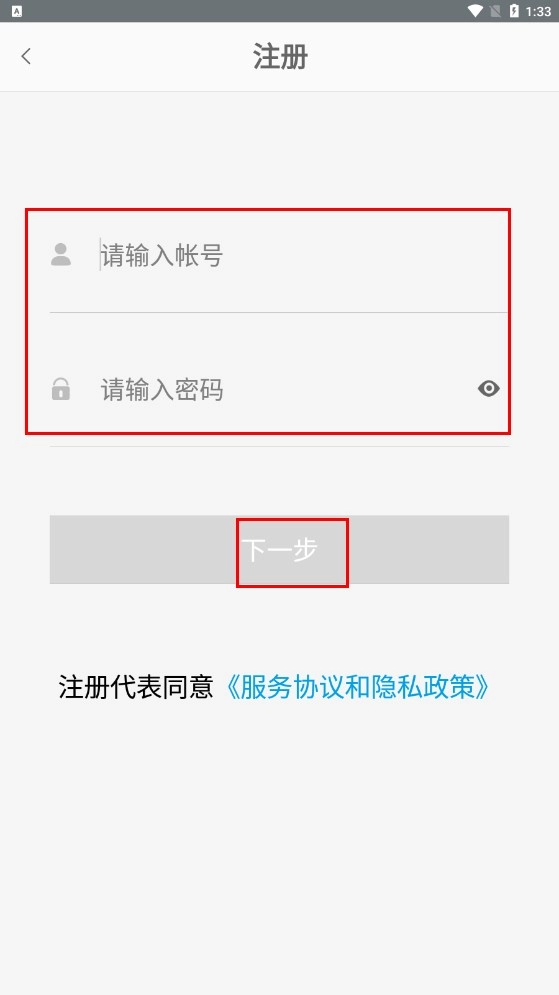4、注册时,先输入账号和密码,再点击【下一步】,即可完成注册流程。
