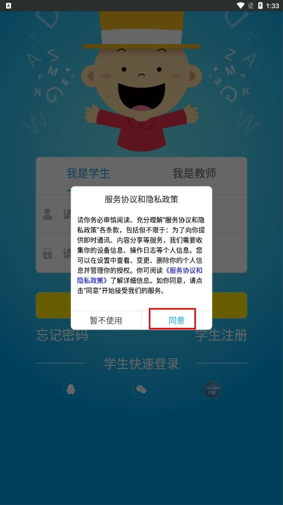 1、仔细阅读【服务协议和隐私政策】,确认无误后点击【同意】按钮,即可进入登录界面。