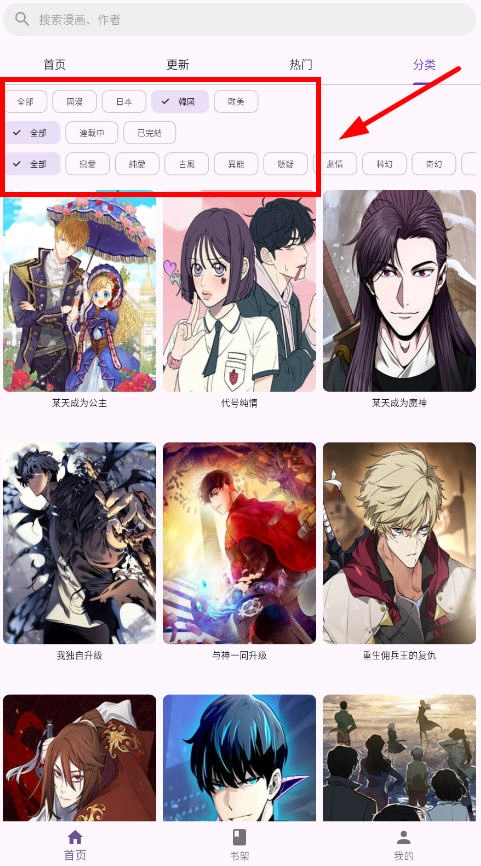 5、点击分类后,还能自行设置韩漫、国漫、日漫等不同类型。