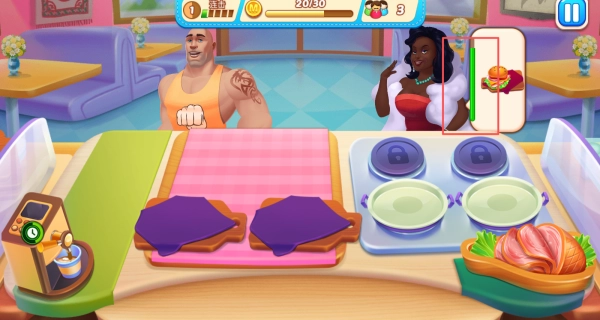 3、每位顾客的头顶都会显示一个等待计时条,你得在计时结束前完成食物制作并送到顾客手中,不然他们就会离开。