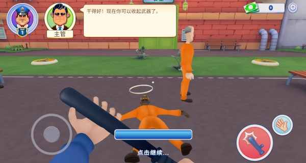 3、在成功制止骚乱、犯人恢复平静后,主管会提示“收起武器”,这时再次点击“点击继续”按钮,即可完成当前任务流程的收尾工作。