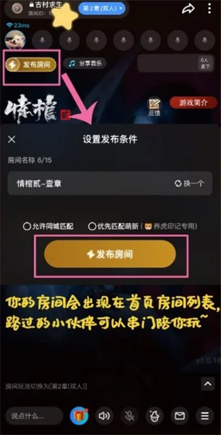 你可以点击房间右上方那个黄色的【召集玩伴】按钮,发布之后,这个房间就会显示在首页的列表里了。接下来你就可以耐心等待其他玩伴加入啦。