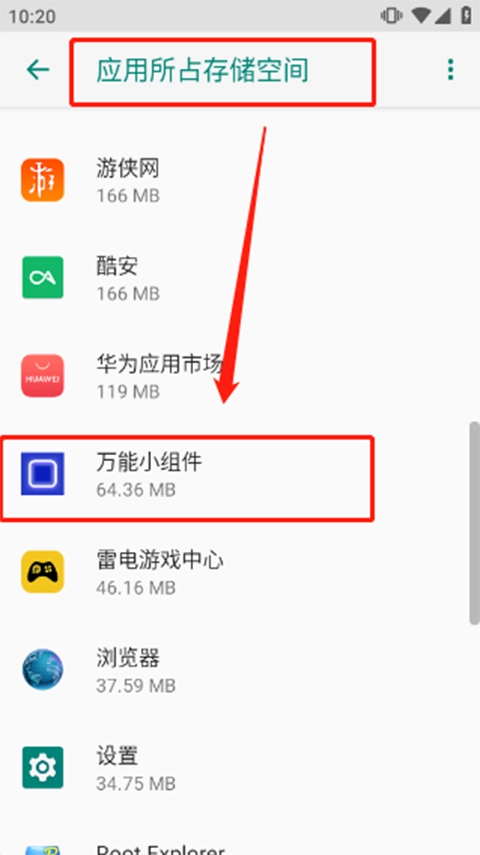 3、进入“应用所占内存空间”界面,找到“万能小组件”。