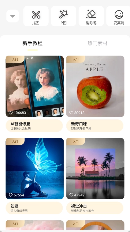 1、抠图功能:点击“抠图”选项后选择需处理的照片,可根据需求选择手动抠图模式或自动抠图模式来完成操作;