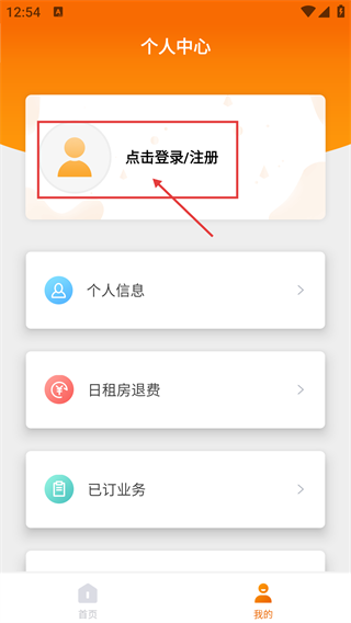 2、进入个人中心后,点击【点击登录/注册】按钮,就能进入登录界面,登录之后可以管理【个人信息】【已订业务】等内容。
