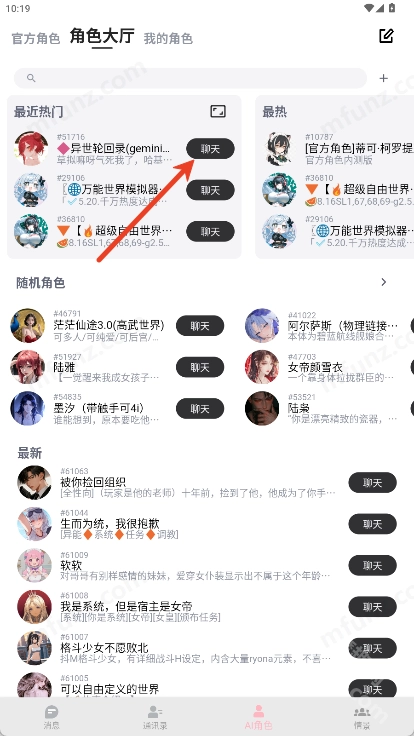 1、打开DicKCat迪克猫AI软件,在角色大厅挑选一款角色后点击聊天功能