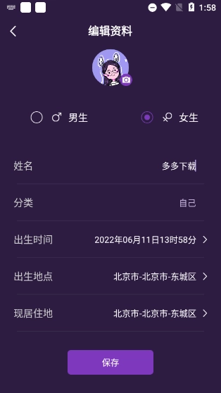 在使用之前,我们需要先登录,接着输入生日等个人信息,之后点击保存按钮。