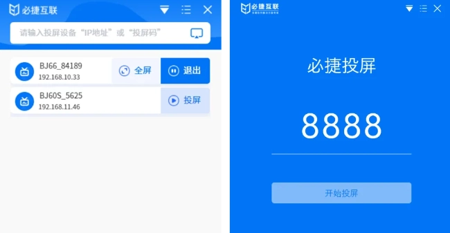 2. 启动必捷投屏应用。在设备列表里找到对应的设备名称,点击投屏按钮后,就能完成投屏操作。