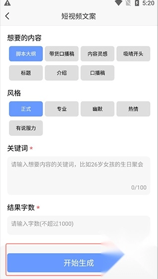 3、依据提示挑选对应的风格,输入关键词并设置字数,点击“开始生成”按钮就能启动创作。