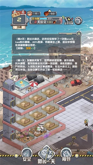 3、当还剩两天时间时,如果计划尚未完成,就卖掉背包让进度刚好达标即可。因为可能会遇到诸如当日清理丧尸导致生产为0这类突发状况,哪怕你背包余量充足但进度差一点,游戏也会直接结束。