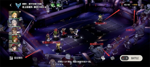 2、竞技场战斗需消耗红酒杯,这里的红酒杯相当于常规游戏中的体力。系统每天上午八点会为玩家重置40点体力,此外还有后备体力,可通过参与日常活动获取,这部分后备体力不会受每日重置的影响。设定阵形的功能是调整进攻与防守的阵容配置,而齿轮图标则用于设置重复战斗的次数。