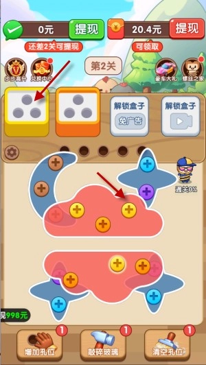 1、进入游戏后,点击图中下方标注的螺丝,它就会自动归位到对应颜色的盒子里。