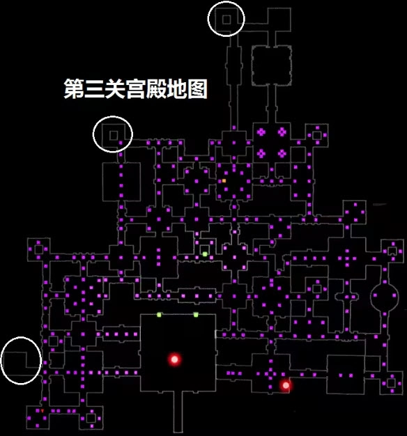 第三关的第二阶段才是这关真正困难的地方。整张地图上有三个绿点,它们都是用来开门的——其中两个挨得很近,这两个里只能拉动一个,拉完后两边的门就会打开,而且只能拉一次。地图里的绿点还能用来打开秘密房间的门,同样只能拉一次。(被白圈圈起来的地方就是秘密所在的位置)