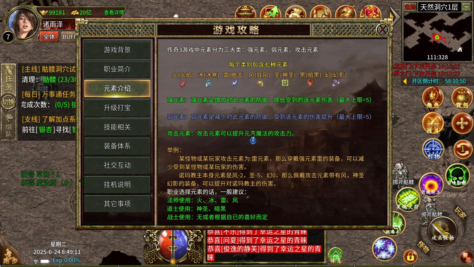 在传奇3游戏里,元素系统被划分为强元素、弱元素和攻击元素三大类别,每个类别下都涵盖了火(火焰)、冰(冰寒)、雷(电击)、风(狂风)、圣(神圣)、黑(暗黑)、幻(幻影)这七种具体元素。