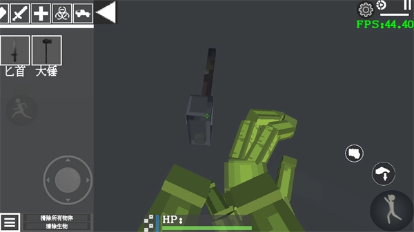 3、与此同时,还可以挑选合适的武器,像匕首、大锤之类的,把目标对准这些武器,按下按键就能将它们拾取起来。