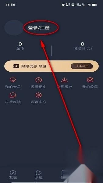 进入打驴动漫后,点击底部最右侧的“我的”选项,进入页面后再点击上方的“登录/注册”按钮。