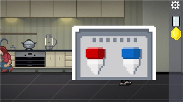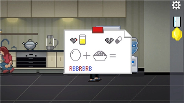 进入靠右边的房间。接着打开冰箱的下层门,能拿到一个黄色的柠檬(这柠檬画得挺逼真,哦,没问题)。此时点击饮水机,在一阵烟雾弥漫(pm2.5严重超标)之后,饮水机桶就装到饮水机上了。根据上图的提示,R对应的是红色red,B对应的是蓝色blue,按这个顺序操作:红蓝蓝红蓝红蓝。