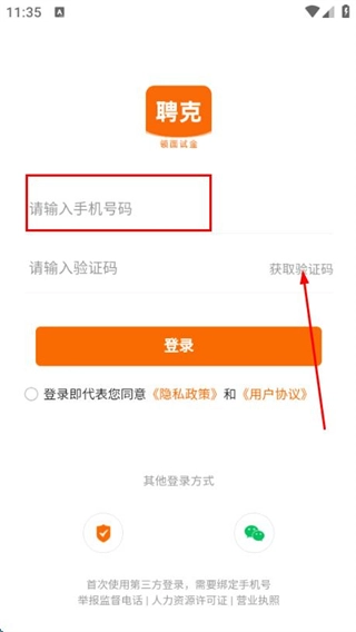 2、在登录页面输入手机号,勾选相关协议后,点击“获取验证码”按钮。