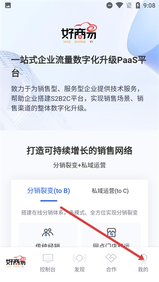 1、点击底部导航栏的【我的】,进入对应页面,该平台为销售与服务类企业提供技术服务,助力搭建B2B2C平台,以实现销售场景的数字化升级。