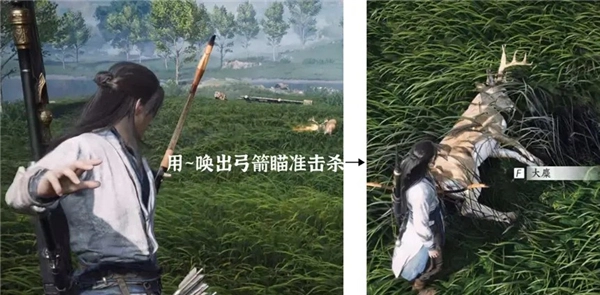 有些肉类需要你先杀死动物才能获得(用弓箭就行,按~键可以切换武器):