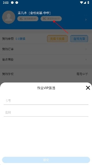 1. 打开新教育学生端并完成登录,进入【我的】页面后,点击顶部的【激活作业VIP】按钮(也就是下图中红色箭头标注的位置),随后在弹出的对话框里填写老师给到的卡号与密码。
