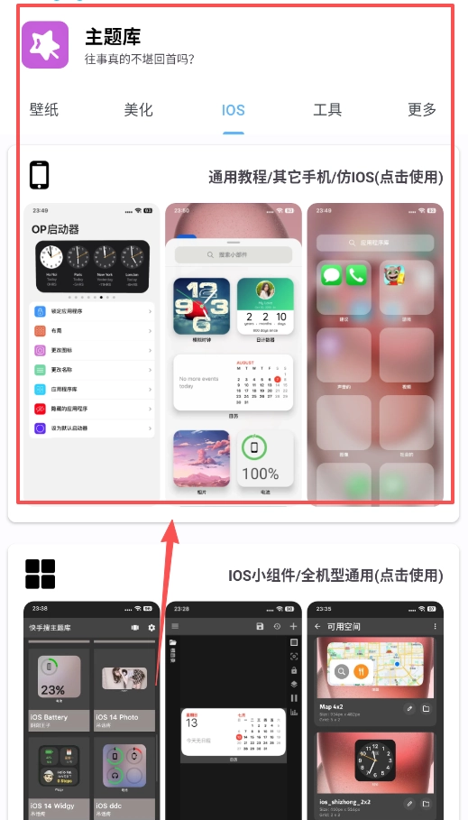 2、要是偏爱简洁的iOS风格,可找到并点击“仿IOS(点击使用)”教程,按照步骤安装“OP启动器”,接着在该启动器的设置里自定义桌面外观就可以了。