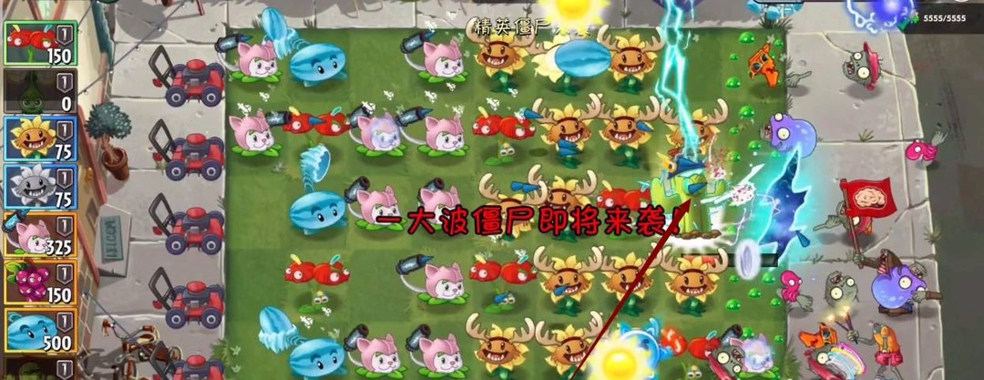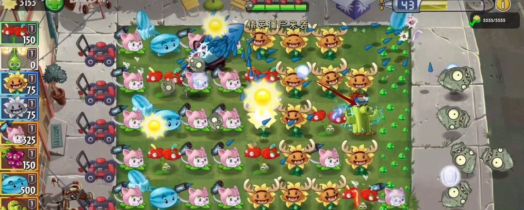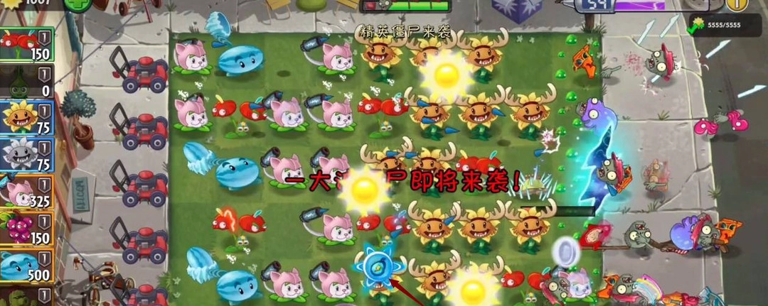 前排逐渐种上向日葵,提供足够的阳光,后排种上猫尾草(发射导向针刺攻击僵尸,有概率造成麻痹效果)、冰西瓜投手(打击成群僵尸,减慢他们的速度)。