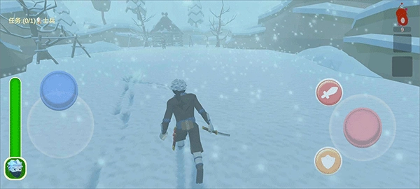 1、进入游戏后,蓝色轮盘用于操控忍者移动,红色轮盘负责切换视角,红色剑形按钮对应攻击功能,黄色盾牌按钮则是防御功能。