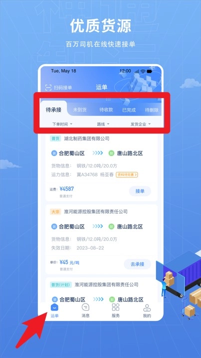 2.在运单界面可查看待承接、已到货等订单状态,支持筛选和接单操作。
