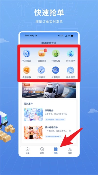 3.点击底部服务按钮进入服务专区,可选保险、油卡、回收货等多项实用功能。