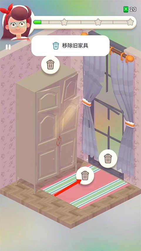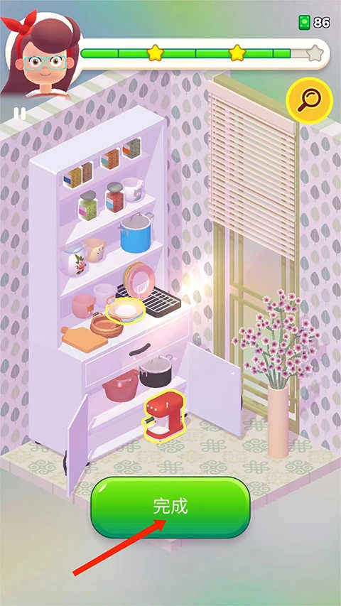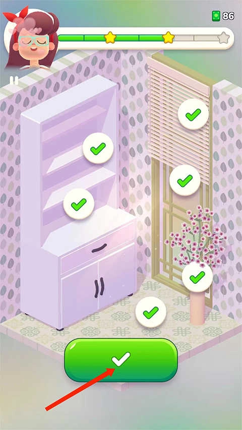 点击【星星】图标,查看装修任务提示,正确摆放家具后女主人会给出反馈评价。