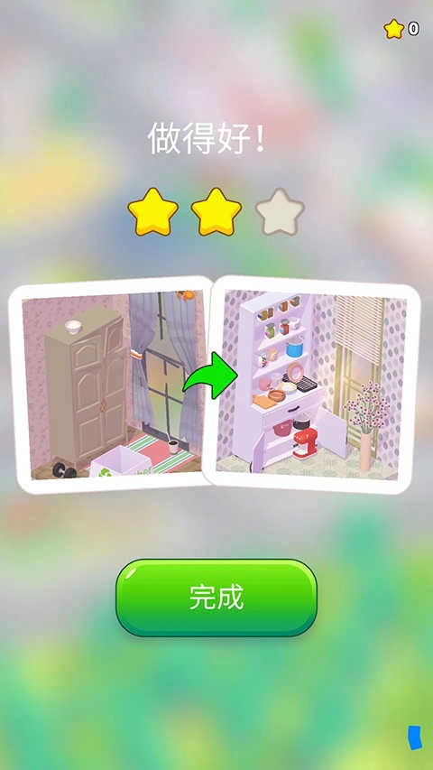 所有物品摆放好之后,点击【完成】按钮,就能查看摆放前后的对比图了。