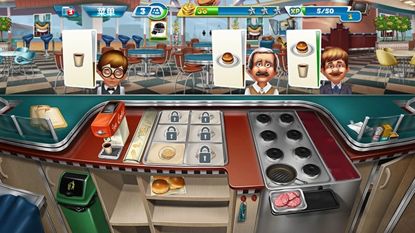 随着玩家逐步解锁关卡,能获取更多新食材与道具,操作也会愈发忙碌。这里分享个小技巧:不少客人会点套餐,而套餐里只要上了其中一款食物就能延长顾客的等待时间,所以可以提前备好一些饮品,用来增加顾客的等待时长。