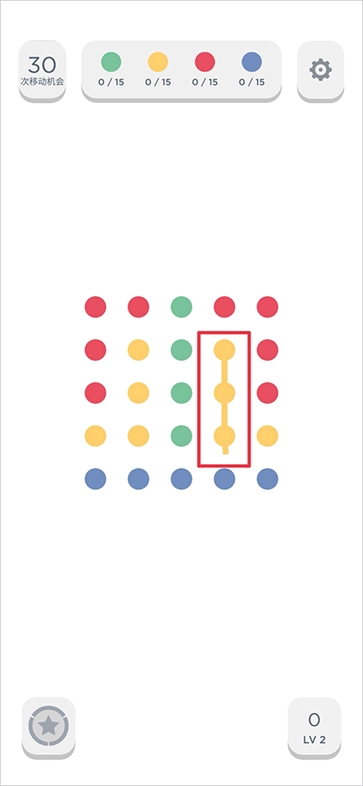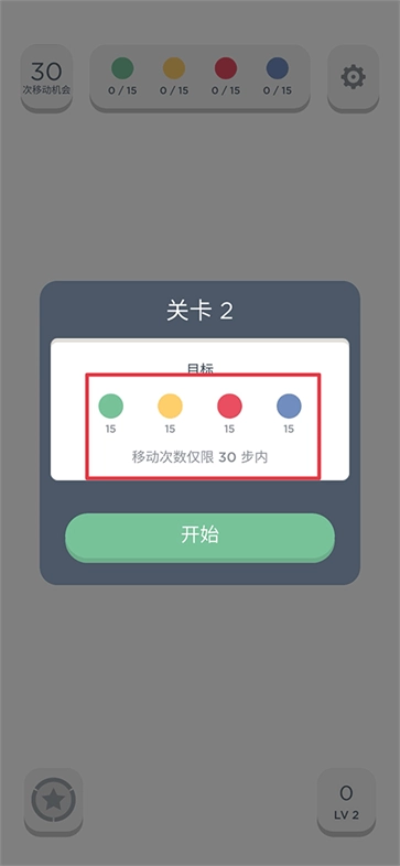 打开游戏进入关卡后,会出现相应的过关条件。比如像图中展示的那样,只要在30步之内让每种颜色点点的数量达到要求,就能顺利通关。