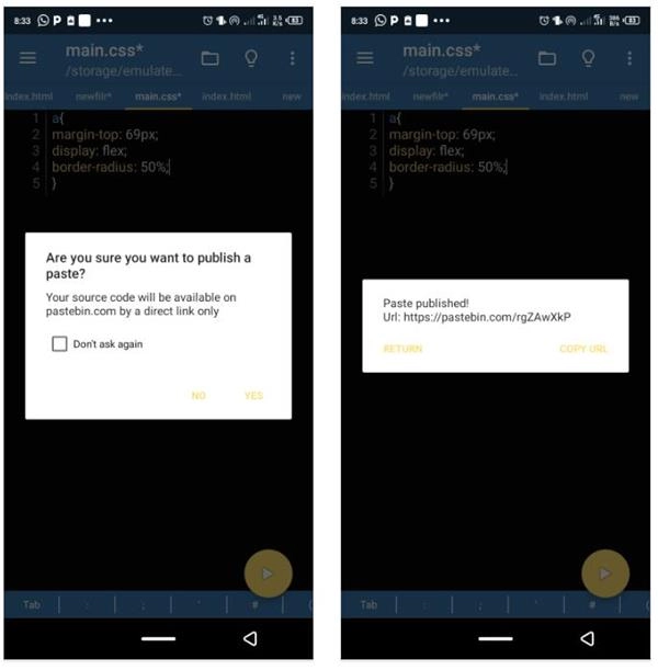 如果您愿意,可以通过Pastebin平台与他人分享您的代码成果。操作方法是:点击应用左上角的三条横线菜单图标,选择“Pastebin”并点击“是”;在弹出的后续菜单中,点击“复制URL”即可获取源代码链接。之后在Android设备上打开任意浏览器,将链接粘贴到搜索栏,就能在Pastebin上查看您的代码,也可将此链接分享给需要访问代码的人。