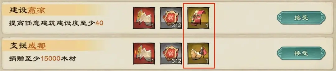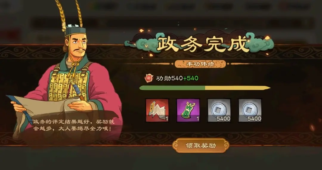 处理建设任务时,可以采用偷工减料的方式,把建设型任务完成到丰功伟绩的程度,也就是政务等级的最高级。每天建设相关的感叹号都有概率掉落元宝,所以强烈建议每天把建设任务做满,毕竟偷工减料不会太耗费资源。要是遇到捐赠类任务,建议只进行一次捐赠;而像讨伐山贼这类任务,则建议完成到最高等级。