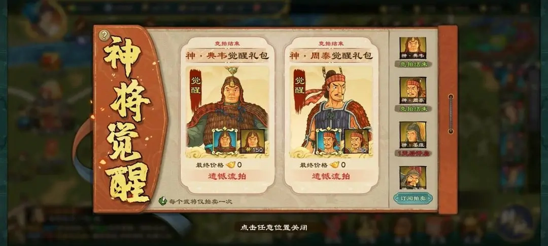这是一个能够获取神将的途径,参与竞价拍卖就能得到武将的觉醒礼包。每个武将的觉醒机会仅在活动当天有效,一旦错过便不会再有。拍卖过程中,主公每次最低加价为100元宝,出价后元宝会立即扣除。要是出价被其他主公超越,扣除的元宝将以邮件形式返还给主公。
