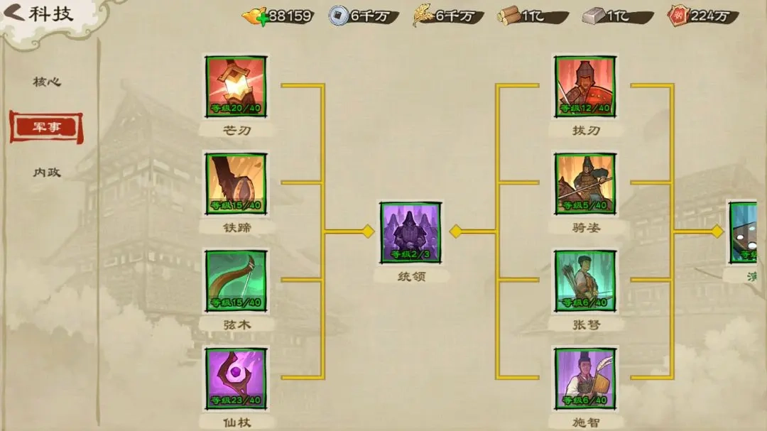 通过升级军事科技,能够借助科技力量提升战力,同时加快获取资源的速度。建议在前期优先提升【内政】相关的科技,这样能更高效地获取更多资源。至于【军事】方面的科技,可以先暂时搁置不升级。