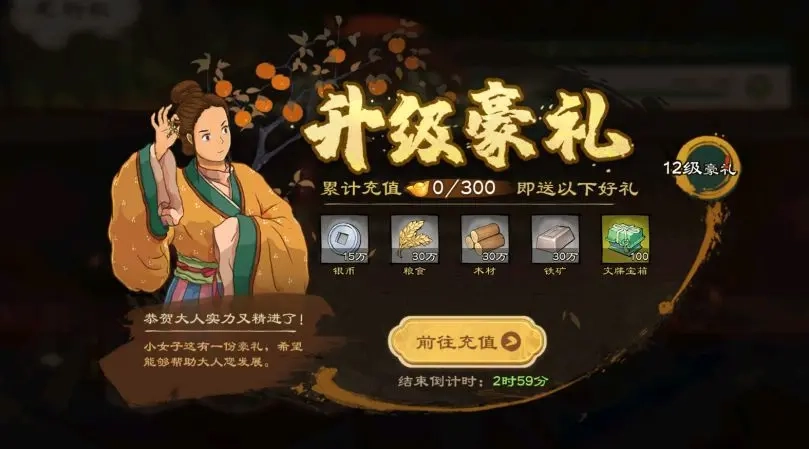 首次充值任意金额即可获得一匹赤兔马,不过装上赤兔马后会弹出另一个充值送鹅毛扇的活动。建议大家第一天或第二天完成首充后先不装备赤兔马,等官邸升级到9-12级期间,利用充值四次触发的奖励活动来获取更多福利。加速道具和资源充足的主公,可以连续升级4次官邸后再装备赤兔马,接着充值领取奖励;而加速道具和资源不太够的主公,则可以分开升级官邸,之后再进行充值拿奖励。