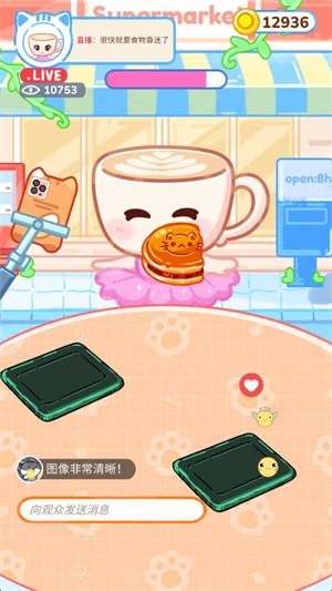 点击左上方的超市图标,就能进入商场选购各类美食;一旦完成购买,直播便会自动开启,待你吃掉所有美食,就能领取对应的金币奖励。