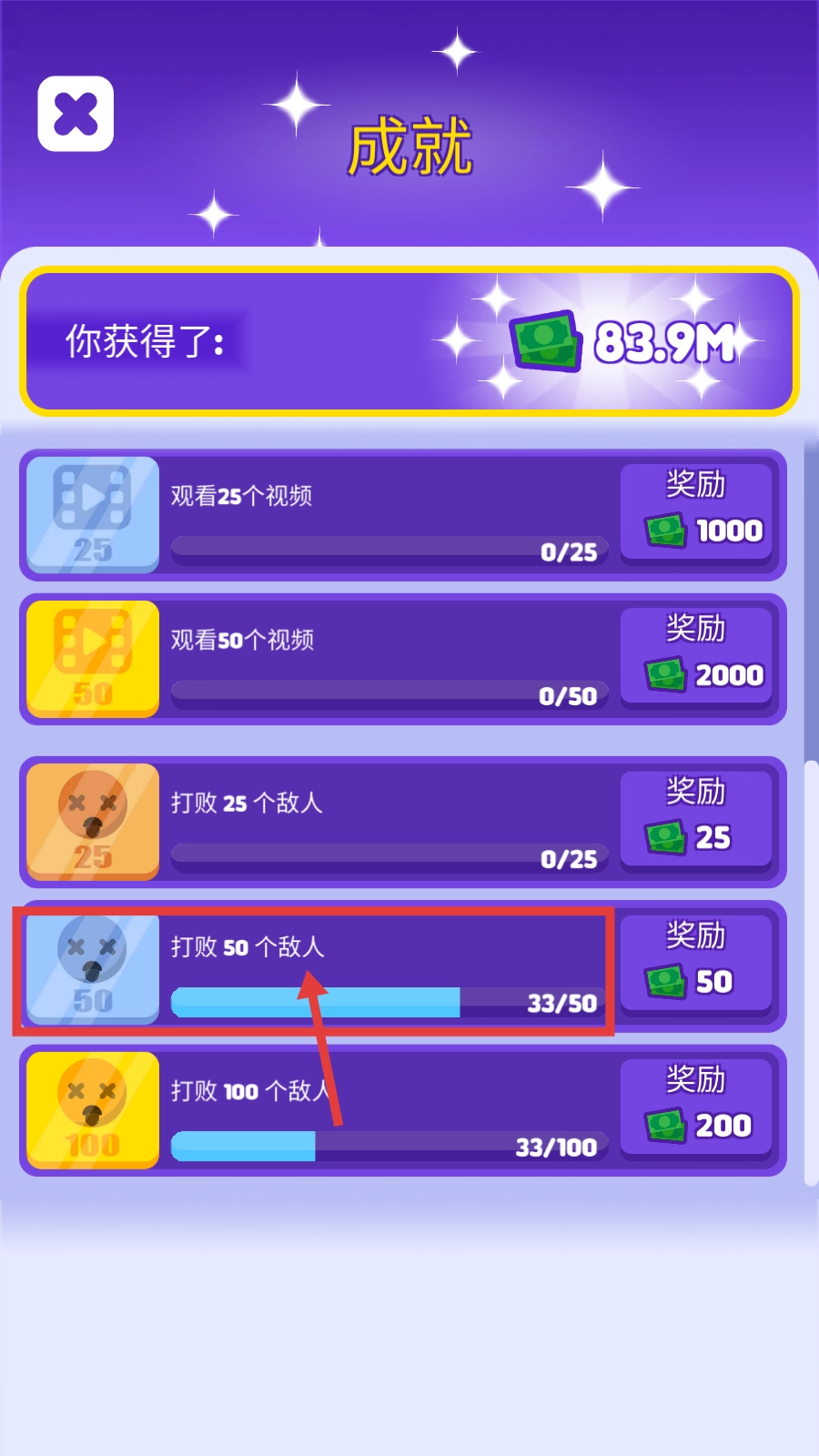 可以留意“击败50个敌人”这类成就(目前进度33/50),达成后能得到钞票奖励(比如击败50个敌人可获得50钞票),通过积累成就进度来提高资源获取效率。