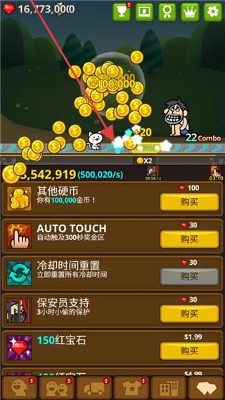 在金币收集界面,只需点击屏幕就能收集金币。收集到的金币可以用来购买【其他硬币】和【AUTO TOUCH】等道具,这些道具能够帮助你提升收益、实现自动化操作,从而更快地积累财富。