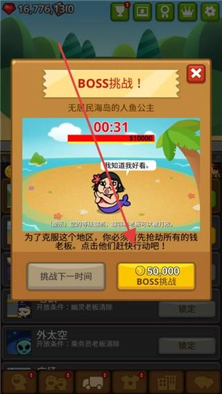 在BOSS挑战界面,当面对“人鱼公主”这一挑战对象时,需要消耗50,000金币来发起挑战。挑战过程中,首先要抢劫所有钱老板,随后击败该BOSS,完成这些步骤后即可解锁新的区域。