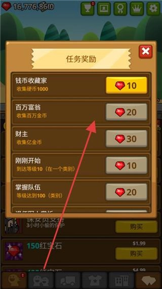 在任务奖励界面中,完成像【百万富翁(收集百万金币)】这类任务后,就能领取相应的红宝石,这些红宝石可用于兑换道具或是进行升级操作。