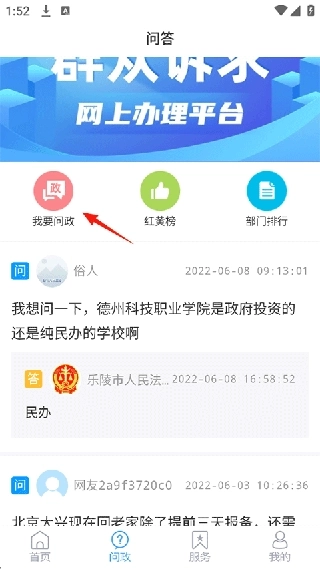 3、点击问政板块,既能浏览乐陵融媒用户发布的各类问政投稿内容,也可通过点击“我要问政”按钮来提交自己的问政信息。